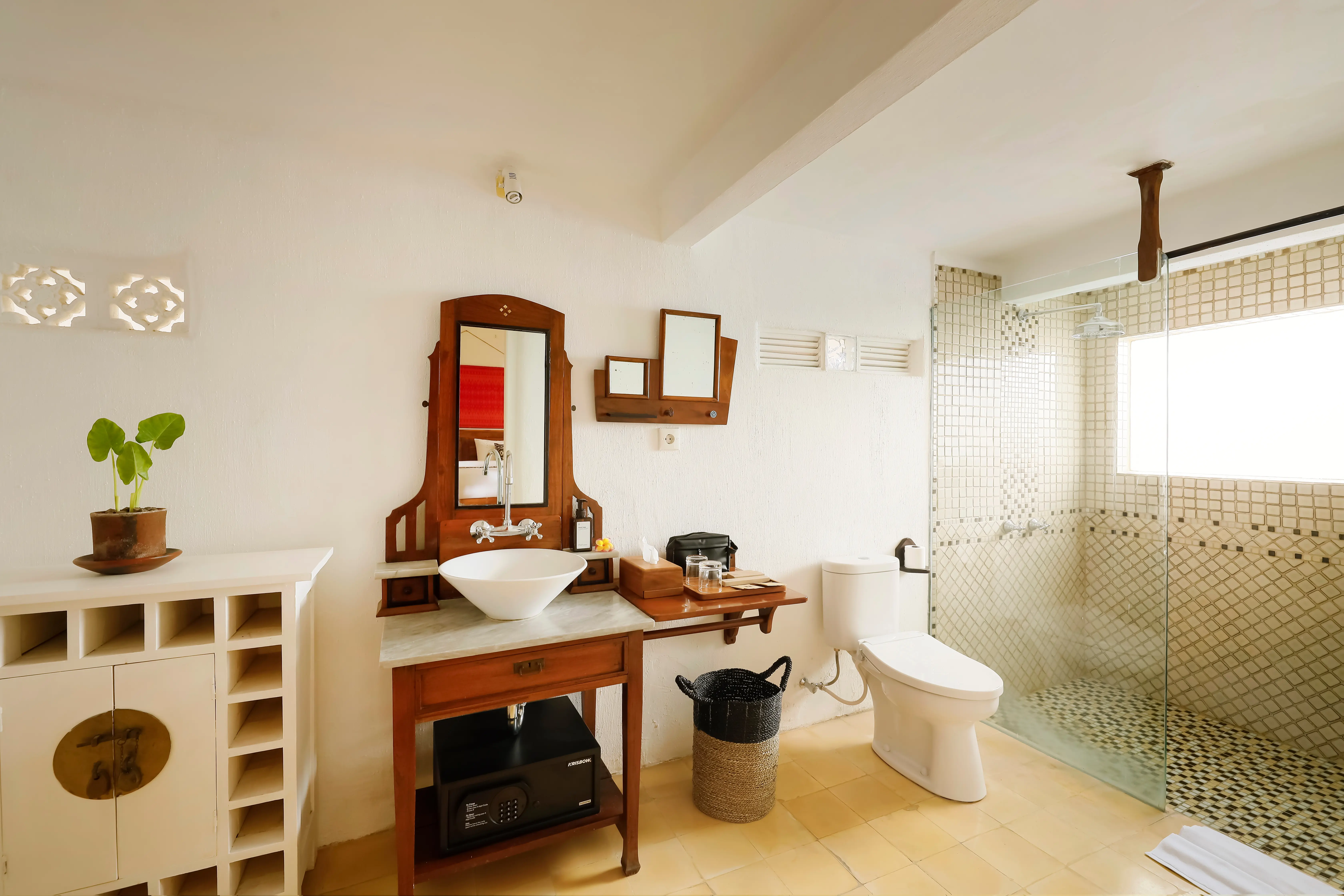 Experience vintage elegance and generous space in our Three Bedroom Villa (Kemuning). Antique décor and tasteful furnishings evoke nostalgic charm, while modern amenities ensure your utmost comfort. The villa consists of three spacious bedrooms: a master suite with king-size bed, soft lighting, and en-suite bathroom; plus additional twin bedrooms. Outside, you’ll find a private pool surrounded by lush garden and a modern kitchen that connects seamlessly to the living room — perfect for relaxation or family gatherings.